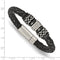 - Antiqued Black Leather Braided Bracelet in Woven Pattern with Barrel Clasp; Crafted in Hypoallergenic Polished Stainless Steel