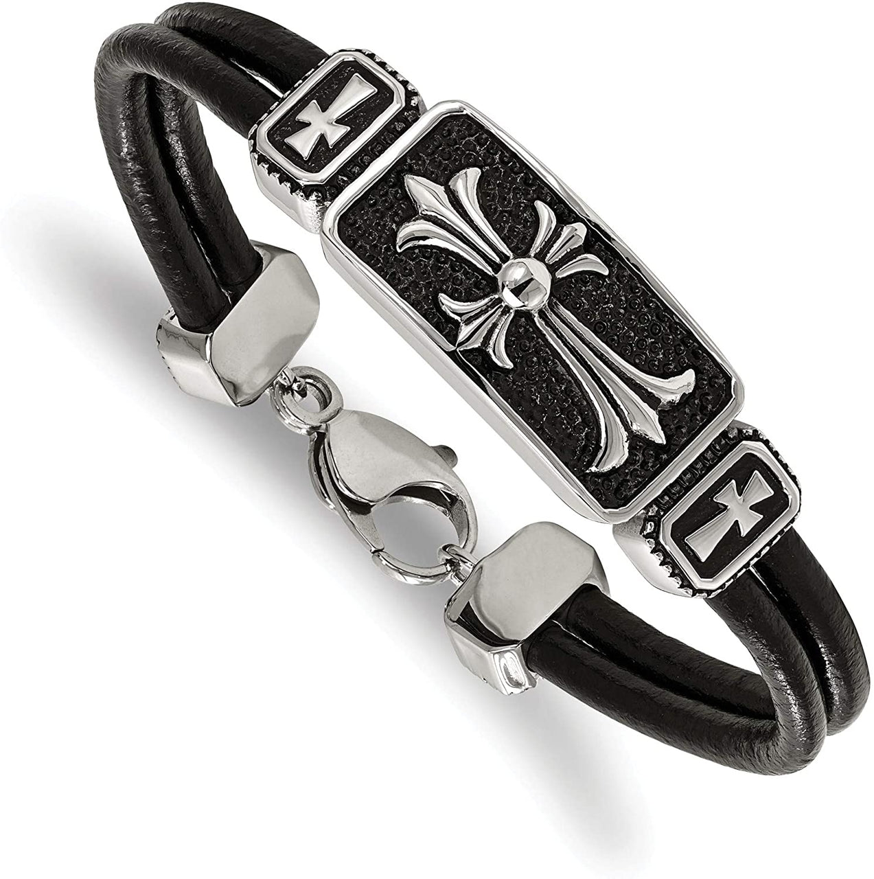 Accessorize with this cool and effortless black leather bracelet. With polished and antiqued stainless steel trim and a black-plated cross on the front, this bracelet secures with a lobster (fancy) clasp.