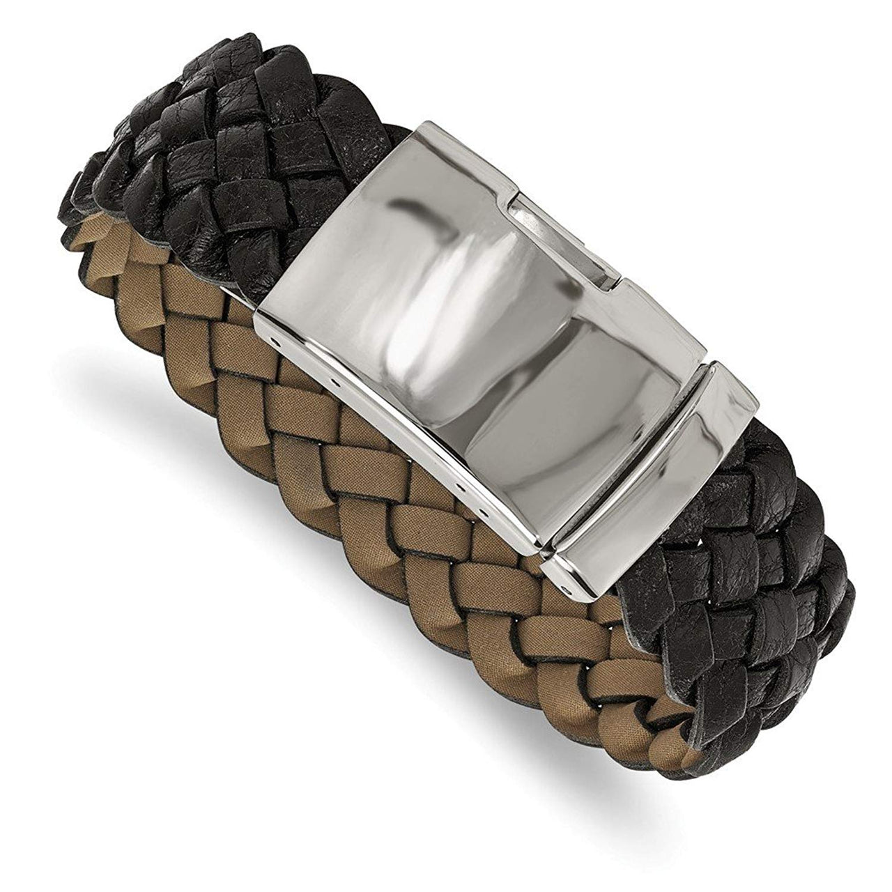 - Black Leather Outer with Brown Leather Inner Side Woven Pattern with Deployment Buckle; Crafted in Hypoallergenic Polished and Brushed Stainless Steel