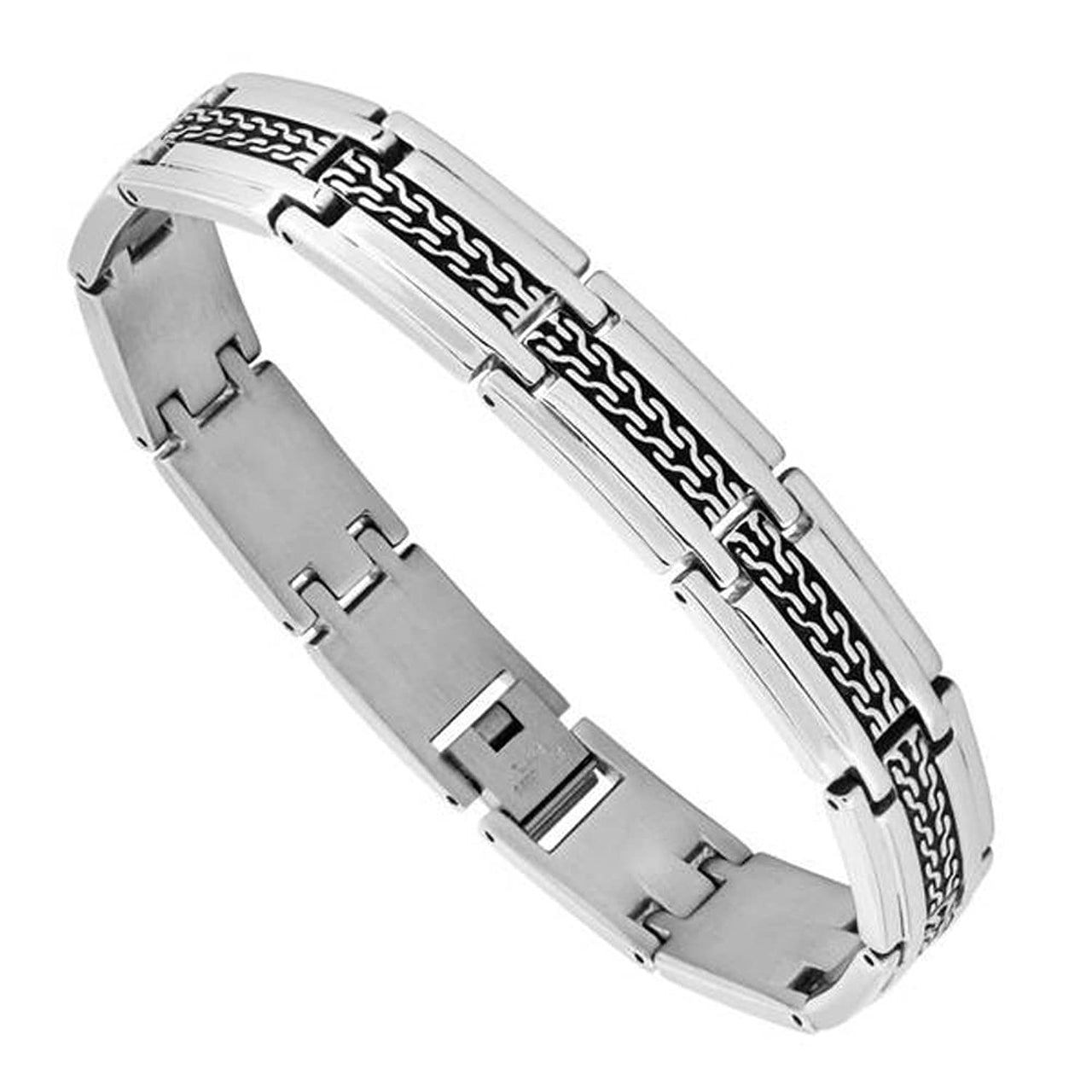 Enjoy the sleek design of this stainless steel men's link bracelet. Highlighted by open steel design in black ion plating, this bracelet is unique and eye-catching.