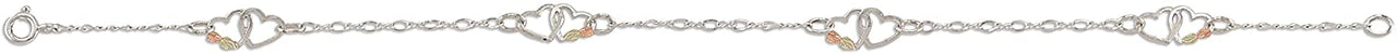 Twin Heart Anklet Bracelet, Sterling Silver, 12k Green and Rose Gold Black Hills Gold Motif, 9"