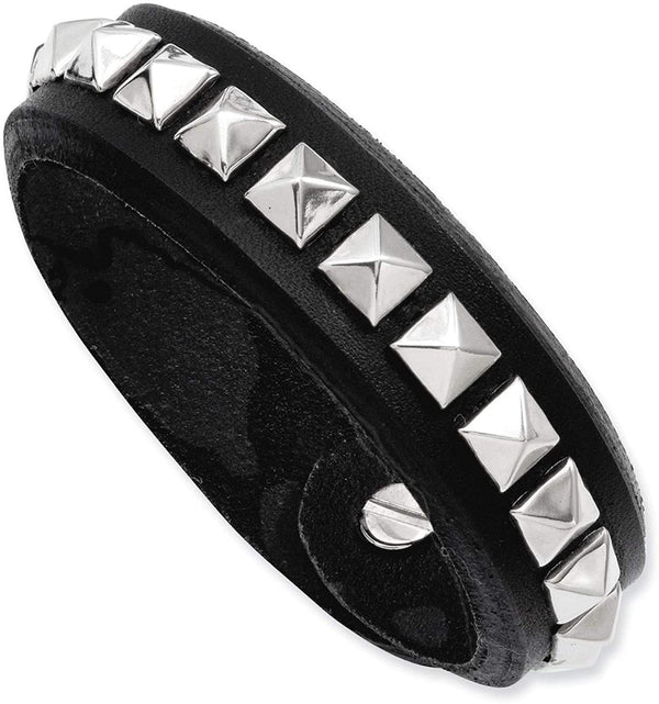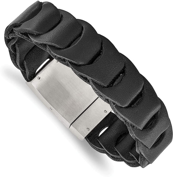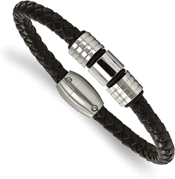 Men's Brushed Stainless Steel Black Leather Bracelet, 8.25"