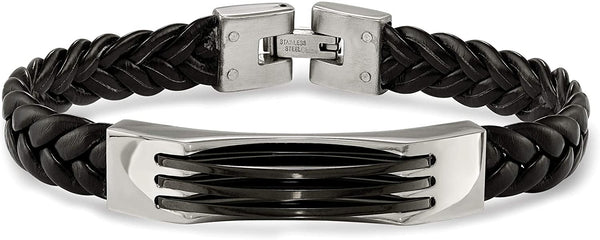 Men's Black Leather Bracelet, Stainless Steel, 8.5"