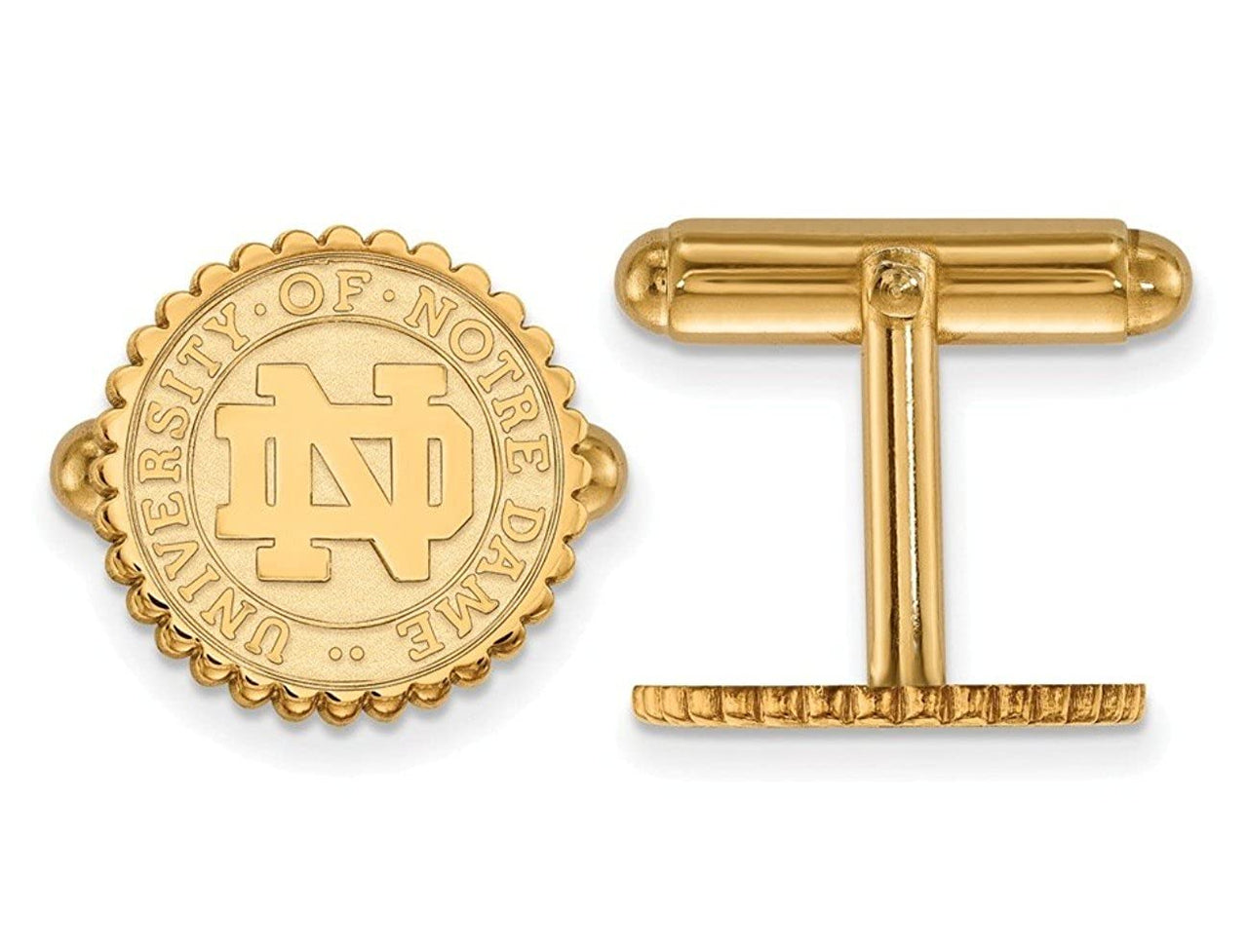 - NCAA University Of Notre Dame Crest Engraved on the Round Cuff Links with Raised Text 'ND' Finished with Bullet Back Clasps; Finished with Bullet Back Clasps; Hand-Finished in Polished Gold Plated and Sterling Silver