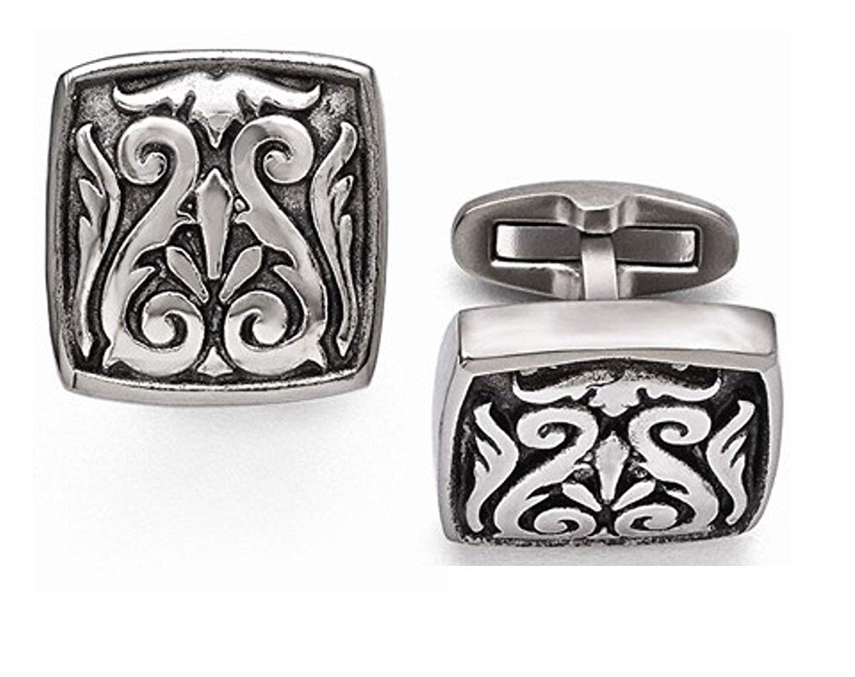 The cuff links are a precious gift to your beloved, a wonderful friend or as a treat for you. These are a sexy and bold look for the stylish, well-groomed man. The exceptional quality cufflinks will add a traditional, yet contemporary and unique style to a man’s wardrobe. If this is a gift, it will be a cherished keepsake and worn for years to come. This handsome pair of titanium cufflinks is designed with an old world look, casted in a mirroring S scroll that resembles a Greek classical lyre, and wings at the top and sides.