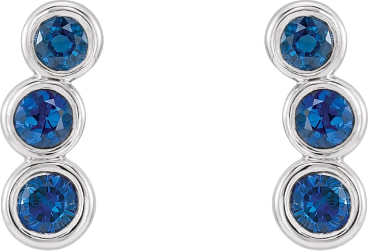 - Graduated Bezel-Set Blue Zircon Three-Stone Secure by Friction Back; Ear Climbers are Crafted in Platinum