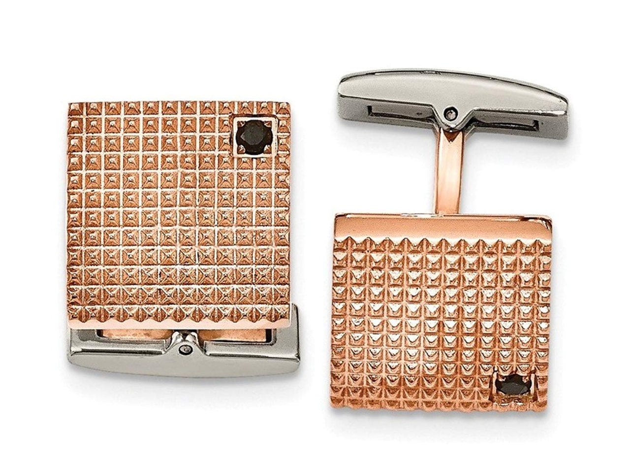 - Square Cuff Links with Rose IP-Plated Studded Texture and Black Cubic Zirconia in Square Inset; Whale Back Cuff Links are Hand-Finished in Polished Stainless Steel