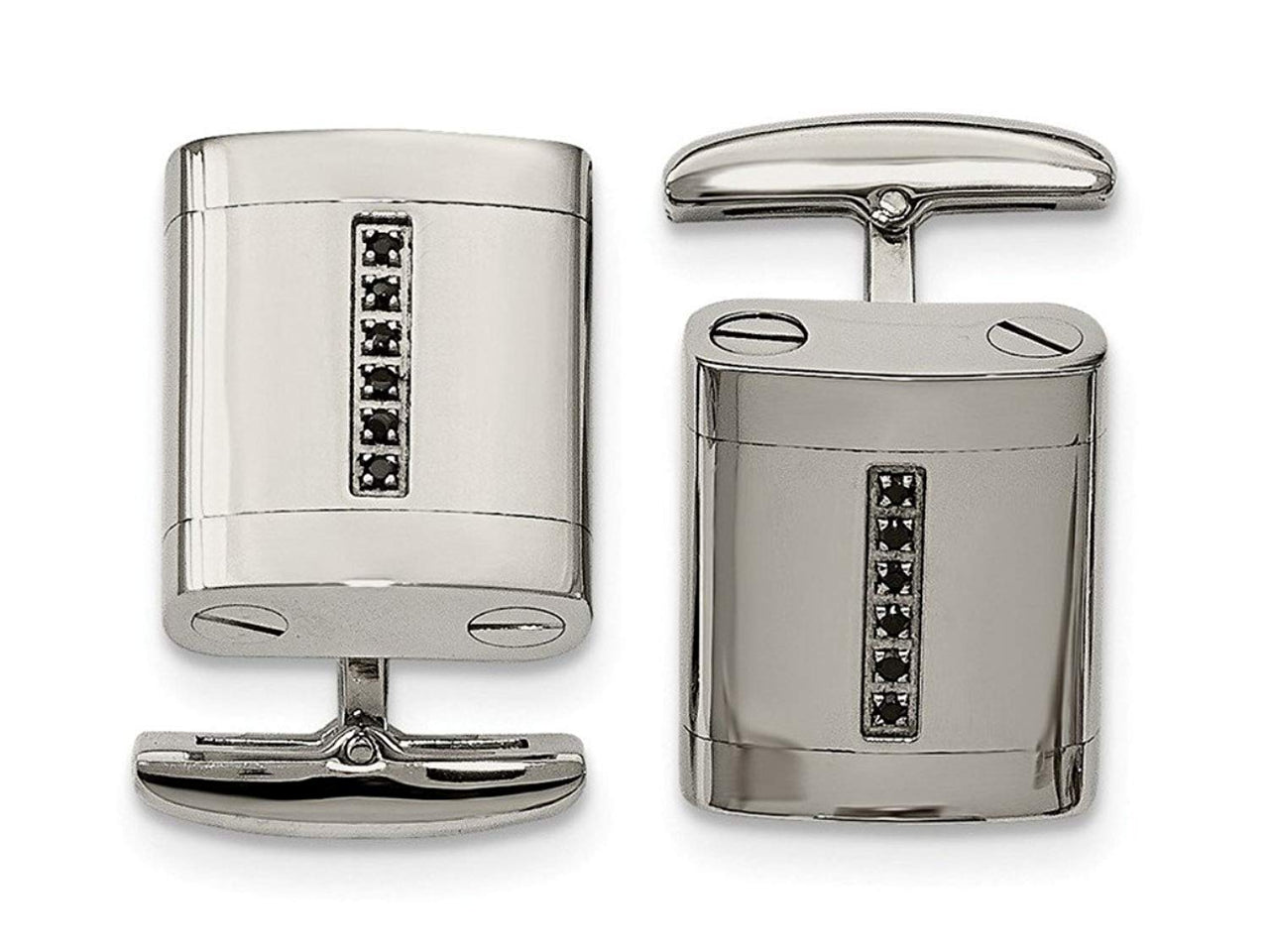- Rectangle Cuff Links with Black Cubic Zirconia Accented in Line On-Center and Whale Back Clasp; Hand-Finished in Polished Stainless Steel