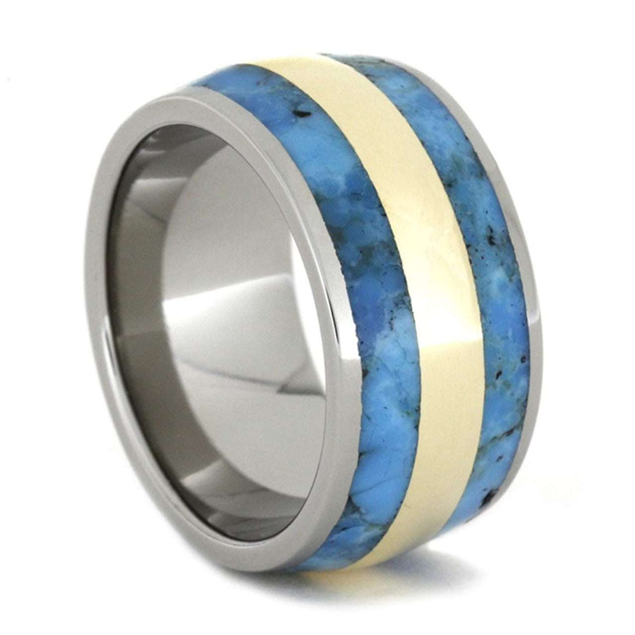 - Wedding Band Features 14k Yellow Gold Stripe Between Two Eye-Catching Turquoise on a Hypoallergenic; Titanium, Dome Profile
