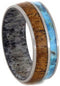 - Comfort-Fit, Brushed Finished, Non-Joint Deer Antler Inner Sleeve Encircles by an Mesquite Wood and Turquoise with Titanium Pinstripe Inlay on a Hypoallergenic; Domed Profile