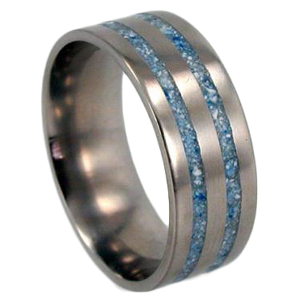 - This Custom Ring Features Two Crushed Blue Turquoise Customer Supplied Pinstripe Inlay a Hypoallergenic; Comfort-Fit, Titanium Brushed Finished