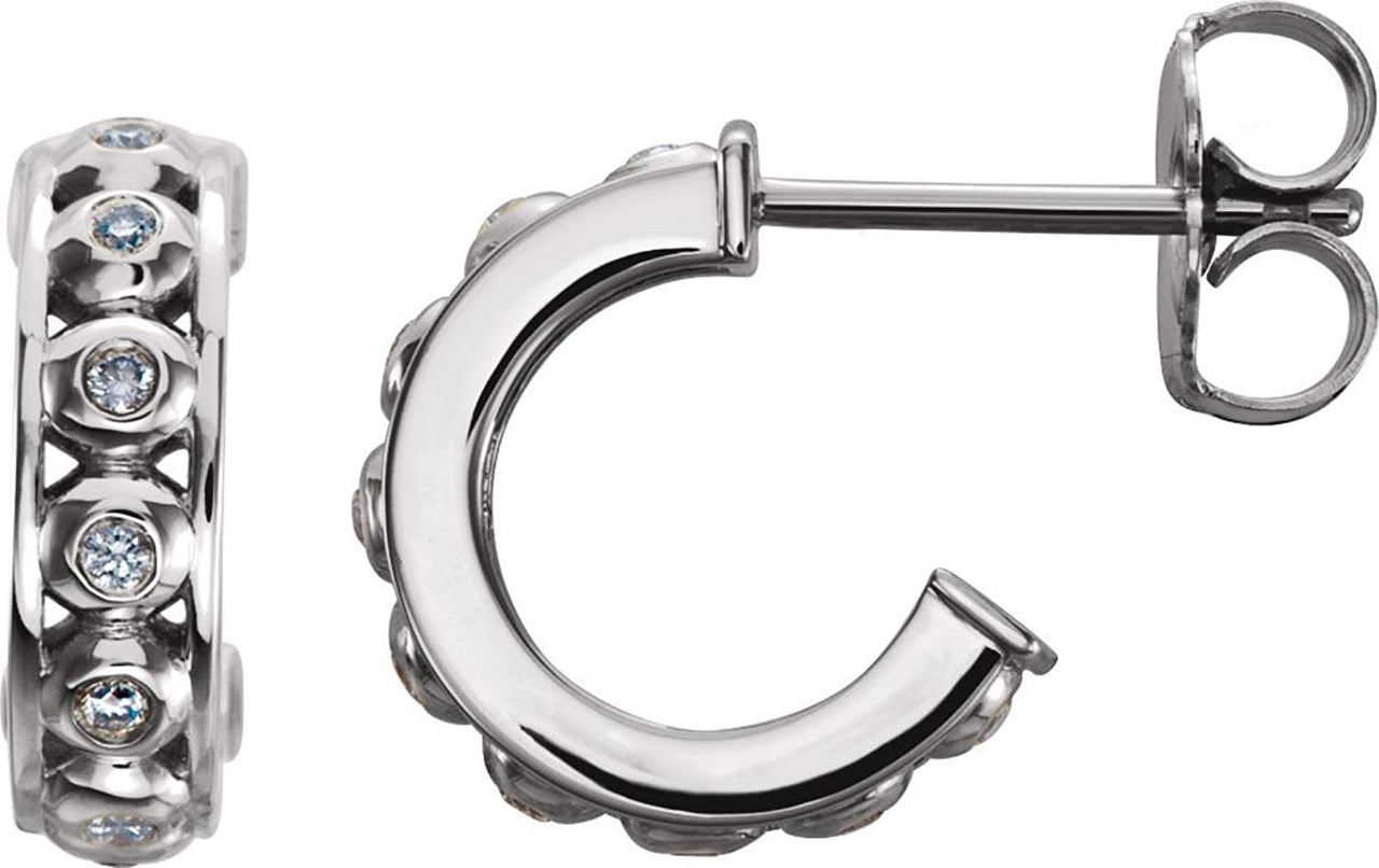 - J Hoop Pattern Earrings Enveloped by Eighteen Bezel Set Diamond with Friction Back; Earrings are Crafted in Polished Sterling Silver