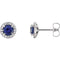 - Halo-Style Earrings Adorned with Inlaid Round Blue Sapphire Encircled with Hand-Set Diamonds Secure by Friction Back; Crafted in Polished Rhodium-Plated 14k White Gold