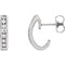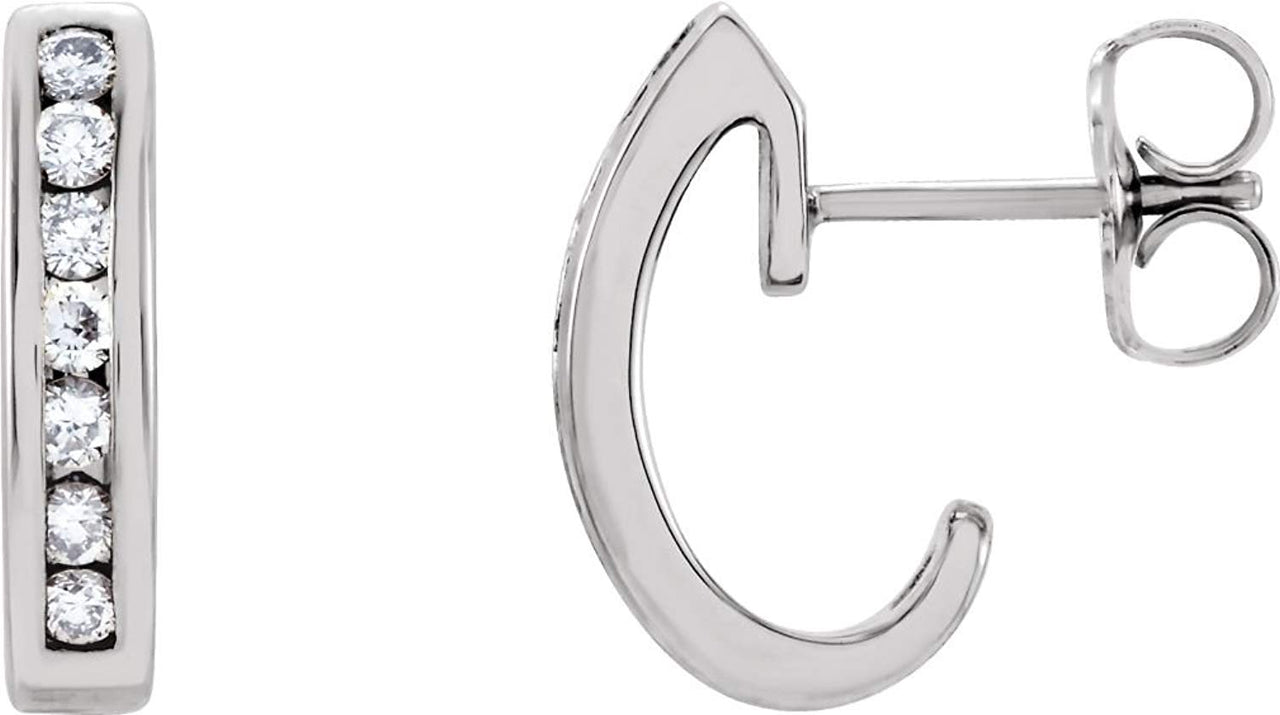 - Fourteen Hand-Placed Diamond on J-Hoop Profile Earrings with Friction Back; Earrings are Crafted in Polished Rhodium-Plated 14k White Gold