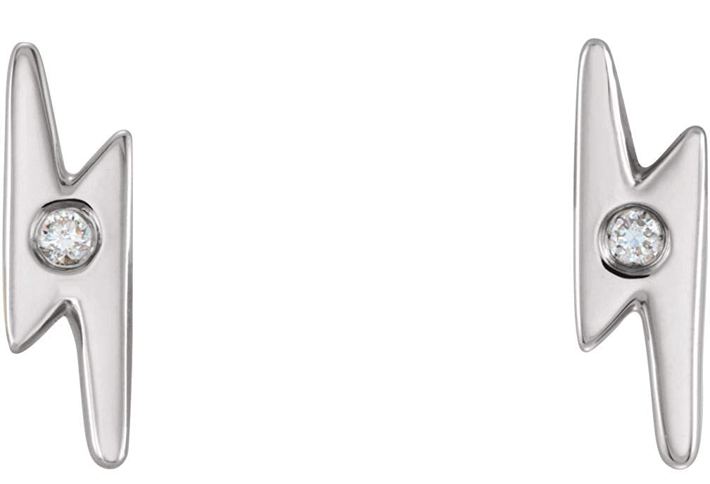 - Hand-Set Diamond On-Center of High-Polished Lighting Bolt Earrings with Friction Back; Crafted in Rhodium-Plated 14k White Gold