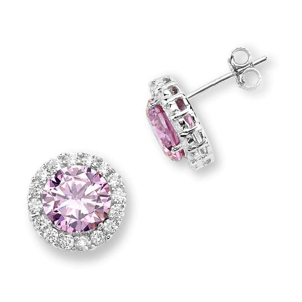 Pink CZ Halo Rhodium Plated Sterling Silver Stud Earrings