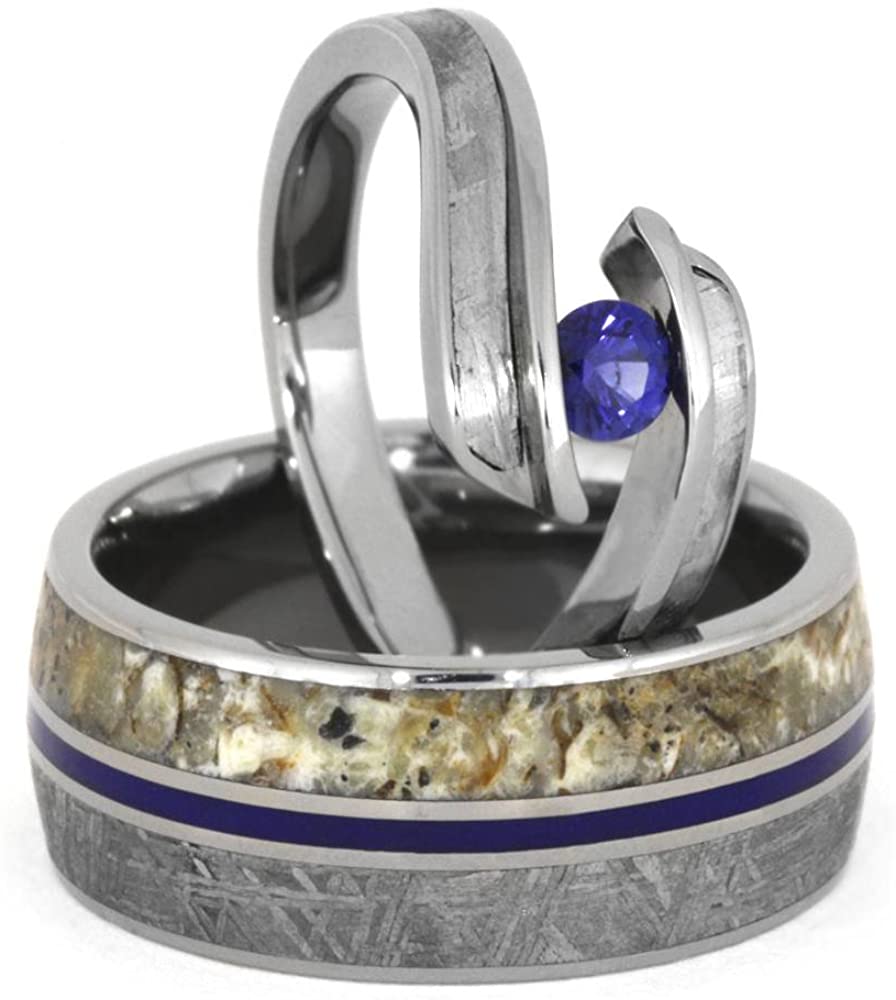 - HAND-CRAFTED Couples Rings: Men's 9.00 Millimeter, Gibeon Meteorite and Dinosaur Bone with a Blue Enamel Pinstripe and Women's 3.00 Millimeter, Meteorite Inlaid Engagement Ring Features a Tension Set Blue Sapphire; Both are Comfort Fit Titanium Rings
