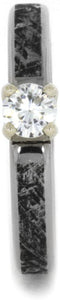 - Forever Brilliant Moissanite Solitaire Set in a 14k White Gold 4-Prong Setting Featured on a Titanium Band with Mimetic Meteorite Inlays and 14k White Gold Pinstripe; Crafted in Hypoallergenic Titanium