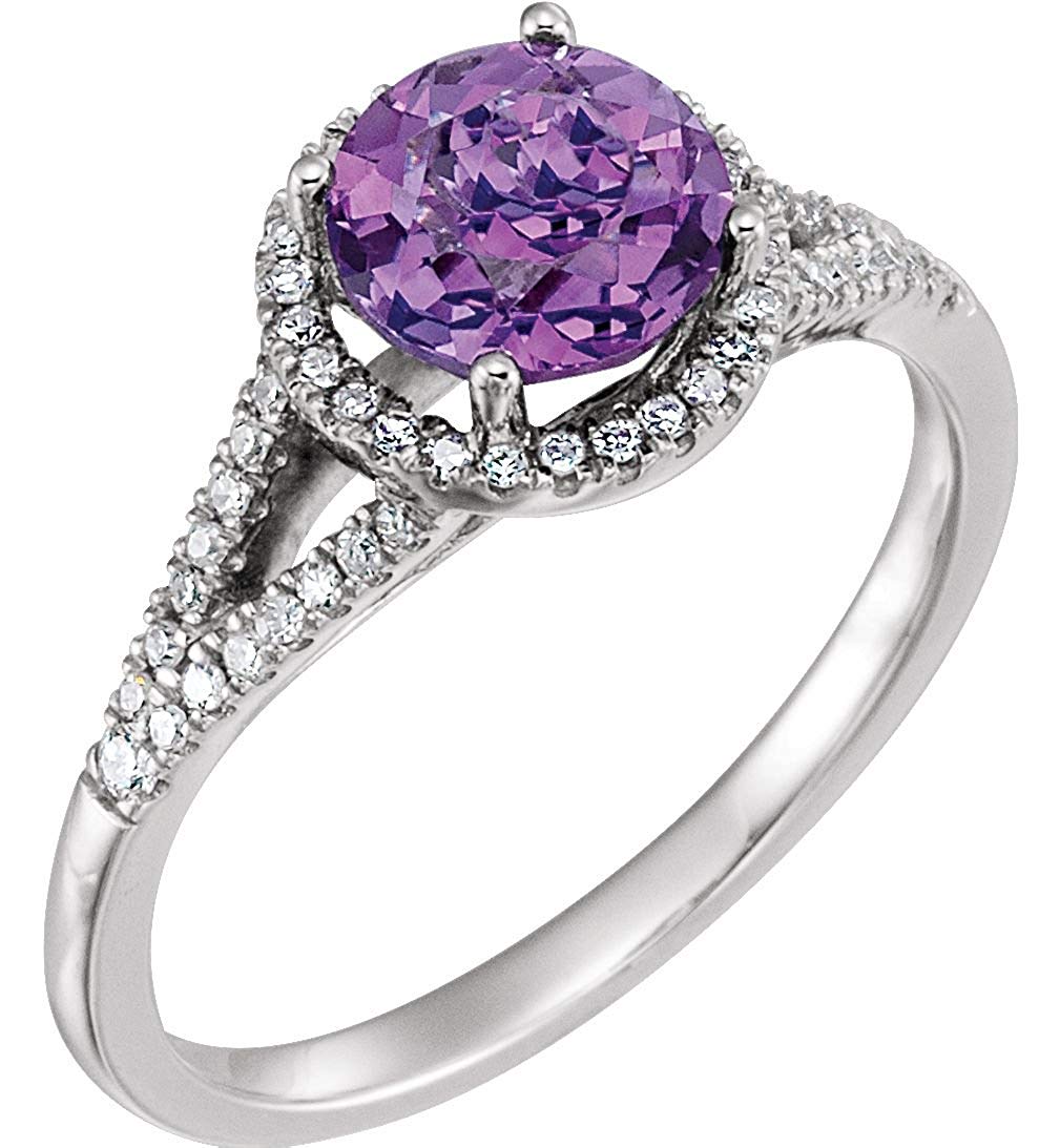 • Halo-Style Ring is Embellished with Round Amethyst On-Center Surrounded by Hand-Set Diamonds with Spilt Shank; Crafted in Polished Rhodium-Plated 14k White Gold