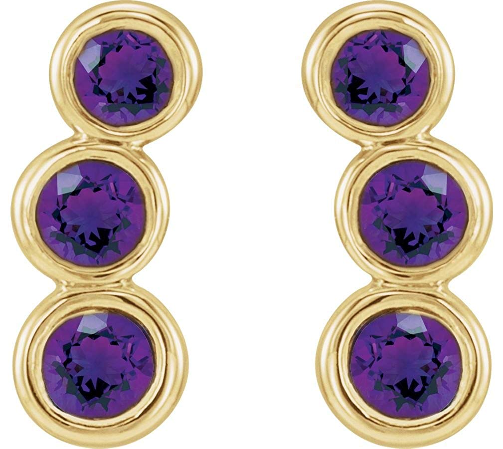 - Graduated Bezel-Set Amethyst Three-Stone Secure by Friction Back; Ear Climbers are Crafted in 14k Yellow Gold