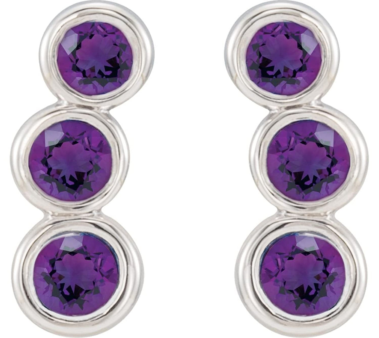 - Graduated Bezel-Set Amethyst Three-Stone Secure by Friction Back; Ear Climbers are Crafted in Sterling Silver