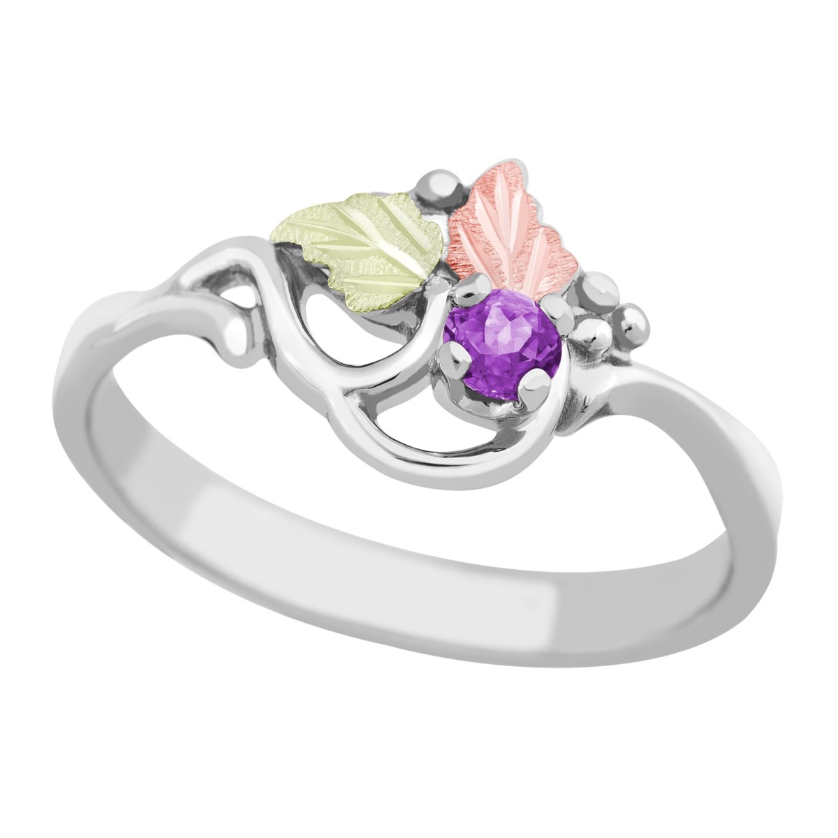 Ave 369 Created Soude Amethyst Round February Birthstone Ring, Sterling Silver, 12k Green and Rose Gold Black Hills Gold Motif