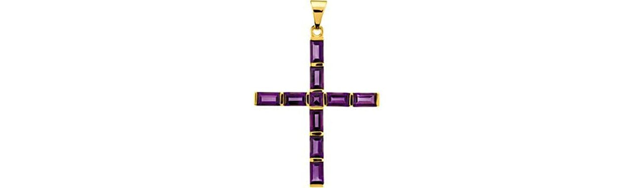 - Cross is Embllished with Gleaming Purple Amethyst Gem is Finished in 14k Yellow Gold