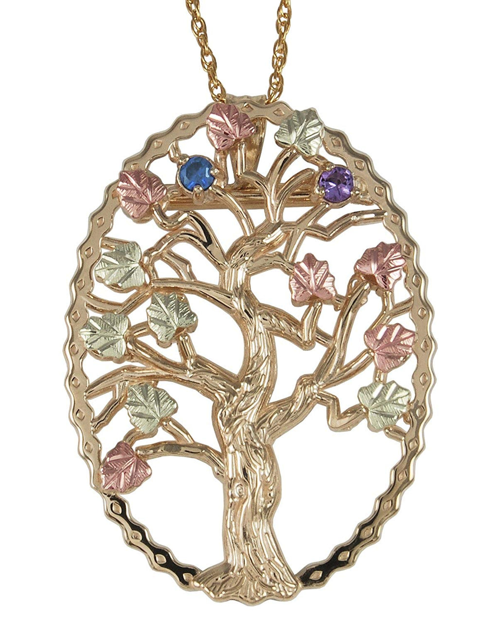 Sapphire and Amethyst Tree Pendant Necklace, 10k Yellow Gold, 12k Green and Rose Gold Black Hills Gold Motif, 18"