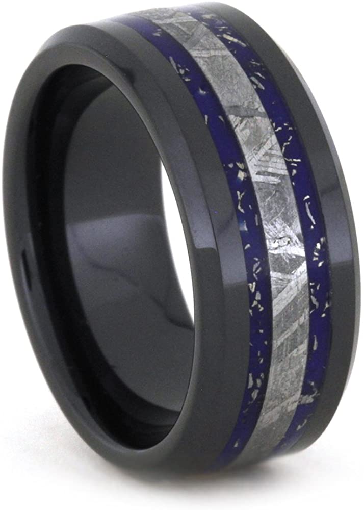 - HAND-MADE Ring is Crafted by Beveled Profile Black Ceramic Sleeve Encases by Two Blue Stardust Pinstripes Surrounding The Center Meteorite Stripe Inlay on a Hypoallergenic; Comfort-Fit Band