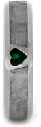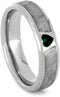 Out of this WorldGibeon Meteorite was discovered by the Nama people. This meteorite fell in prehistoric times in Namibia, Africa. The meteorite created a debris field 1.71 miles long by 62 miles wide. This unique wedding ring set pairs a titanium green box elder wood ring with a white gold meteorite engagement ring. The emerald shimmers in a heart shape, framed by 14k white gold.