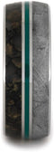 • Comfort-Fit, Polished Finished, Hypoallergenic Titanium Sleeve Enveloped by an Gibeon Meteorite, Dinosaur Bone Overlay with a Pinstripe of Green Enamel; All Materials Bands are Continuous with no Joints; Dome Profile Band