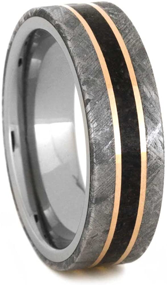 - Comfort-Fit, Flat Band is Crafted with Gibeon Meteorite and Dinosaur Bone Between Two 14k Rose Gold Stripe Inlay on a Hypoallergenic; Polished Titanium Band