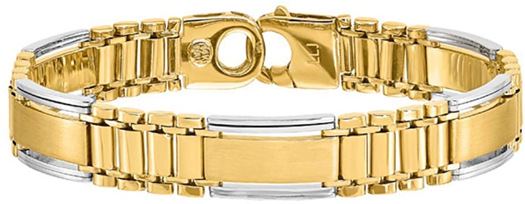 Luxurious, elegant, and a classic this two-tone 14k yellow and white gold link bracelet. Featuring a bold, fancy oval link design with fancy link, this men's bracelet brings a touch of sparkle to any casual or formal ensemble. Italian artistry and craftsmanship complement bold styling and elegance. Gentle on skin due to being nickel free and it has an easy to use fancy lobster clasp, the Bar and Panther Link combines two complementary elements into one intriguing design. Capturing the best of both styles bar links consist of bars parallel to each other and panther links are in an alternating brick pattern with small half moon-shaped links. The Italian Bracelet Chain Link Jewelry Collection captures elements of luxury and sophistication for both ageless and timeless creations.