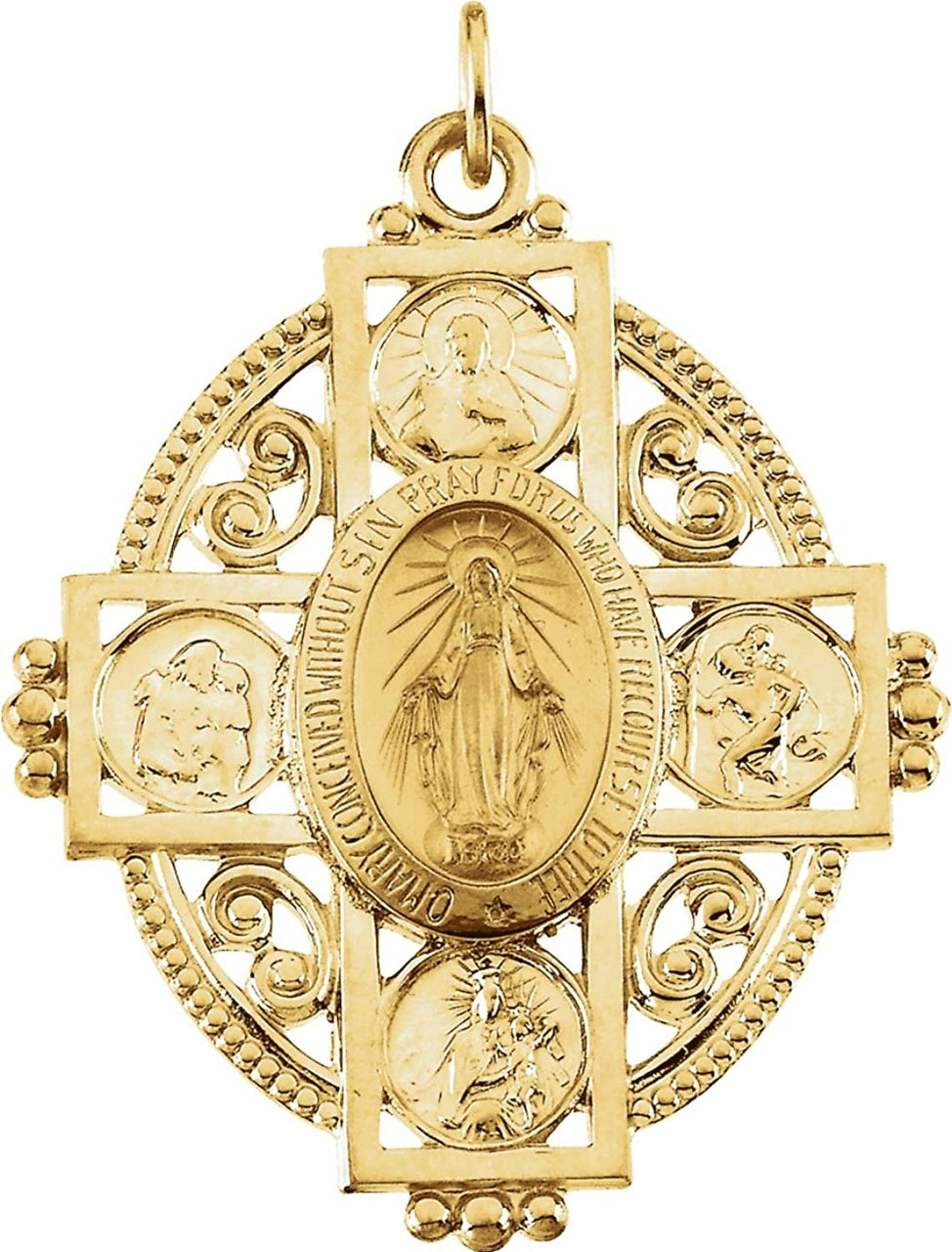 - 35.00 Millimeters X 28.00 Millimeters Miraculous Cross Medal Crafted in Polished 14k Yellow Gold