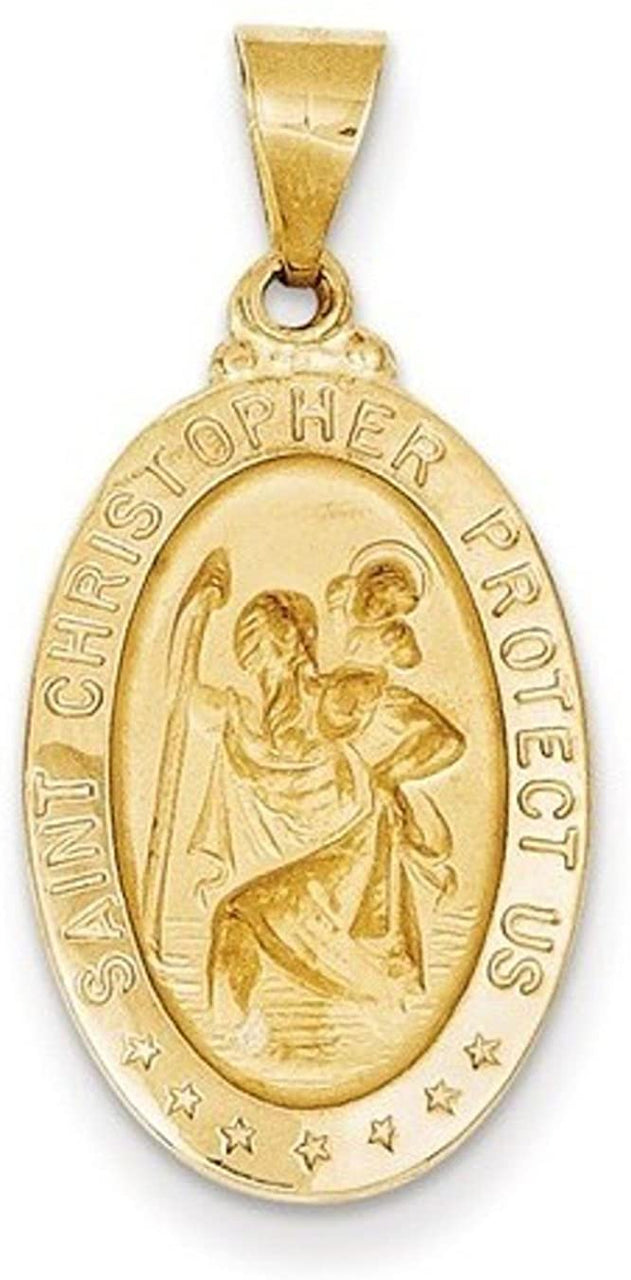 - Engraved Text 'Saint Christopher Protect Us' Encircles the Outside of the Medal; Raised, Sculpted Angel with a Stick in One Hand and the Child Over a River on his Shoulder; Background with Saint is Stippled; Die Struck, Hollow Medal is Crafted in Polished and Satin 14k Yellow Gold