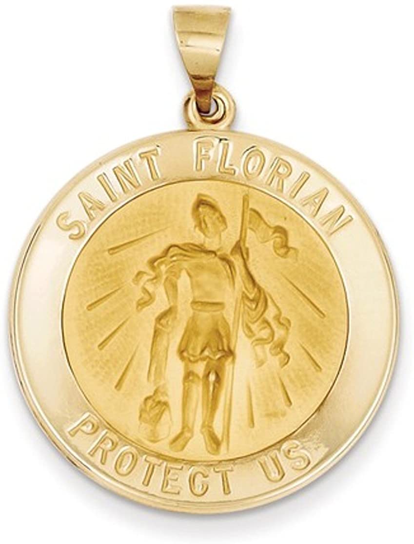- Engraved Text Round 'Saint Florian Protect Us' Encircles the Medal; Die Struck, Hollow Medal is Crafted in Polished and Satin 14k Yellow Gold