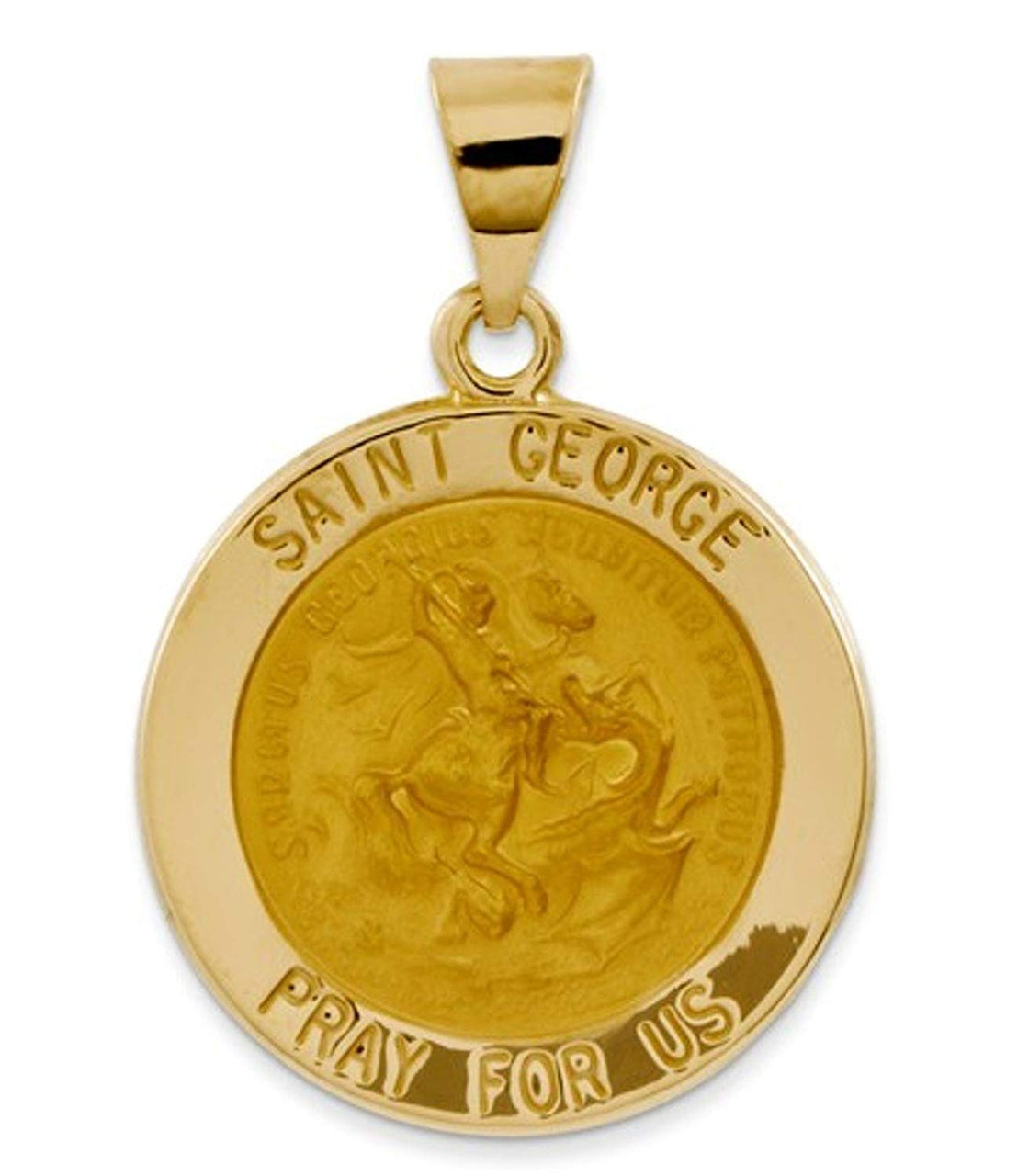 - Engraved Text 'Saint George Pray For Us' Encircles the Medal; Die Struck, Hollow Medal is Crafted in Polished and Satin 14k Yellow Gold