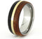 This intriguing titanium, wood ring is overlaid with a striking combination of African Blackwood, 14k Yellow Gold and Amboyna wood. The overlays wrap all the way around the ring, with no joints, providing a smooth, seamless finish.