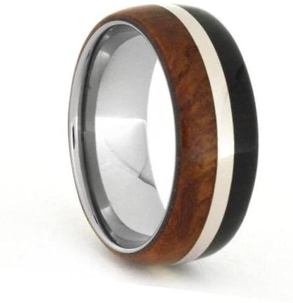 - Exotic, Non-Jointed Amboyna and African Blackwood with a Pinstripe of Lush 14k White Gold On-Center of Round-Profile Ring; Comfort-Fit Band is Crafted in Hypoallergenic Titanium