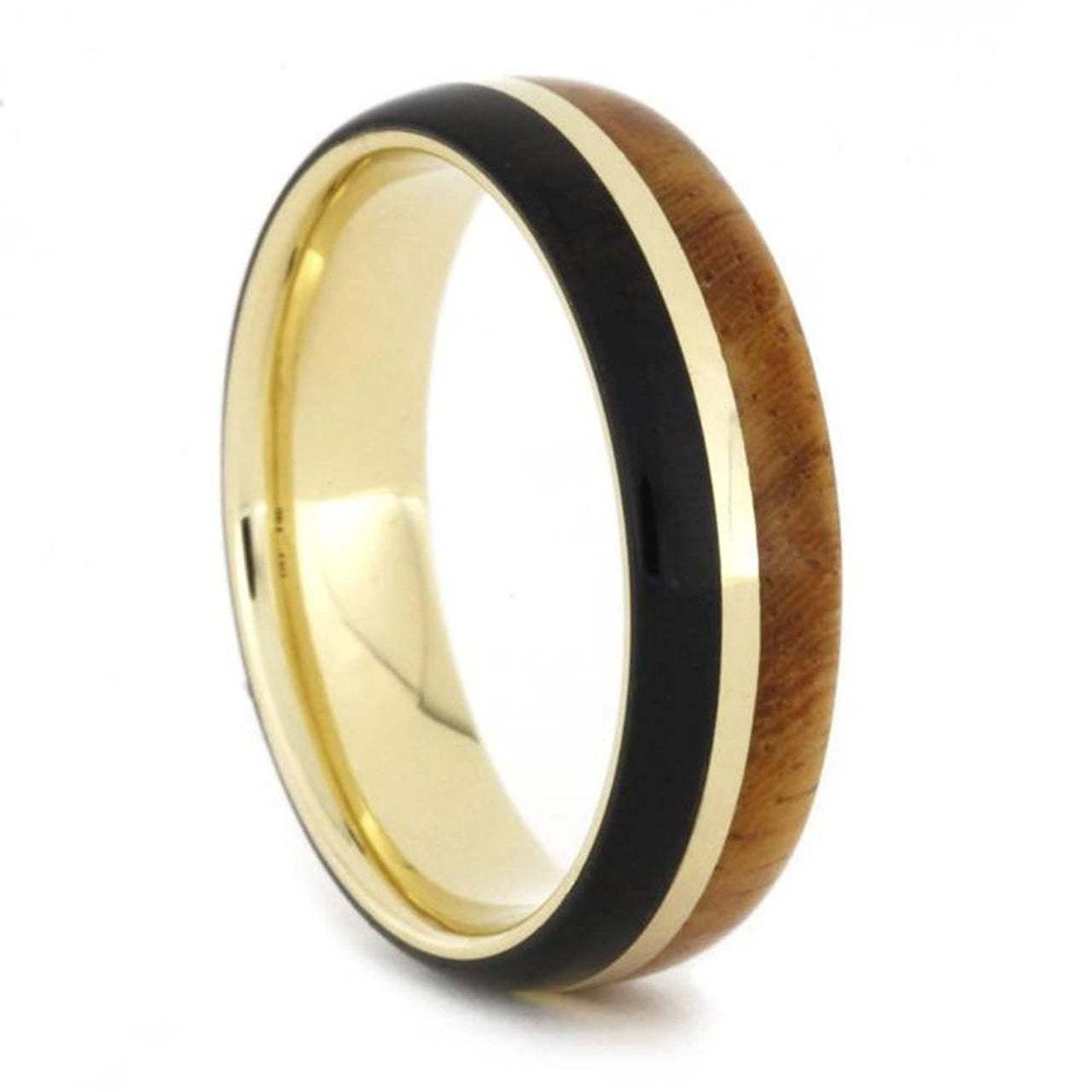 Amboyna Burl, African Blackwood 6mm Comfort-Fit 14k Yellow Gold Band, Size 9.75