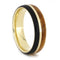 Two wood species pair up to embellish this gleaming, 14k yellow gold ring. Separated by a slender gold pinstripe is African blackwood and amboyna burl. These two woods contrast each other nicely, giving the wedding band some great dimension.