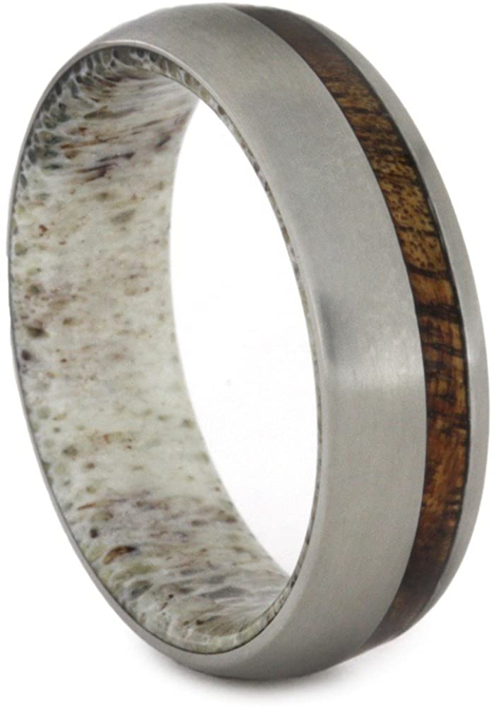 - Dome Profile, Matte Finish, Non-Jointed, Deer Antler Sleeve Encases by Koa Wood Stripe Inlay on Outer Sleeve; Ring is Hypoallergenic, Titanium Comfort-Fit Ring