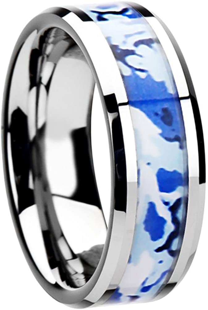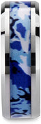 - Wedding Band is Crafted with Blue Arctic Camo Print Pattern Inlay on a Hypoallergenic; Comfort-Fit, Tungsten, Beveled Edged Profile