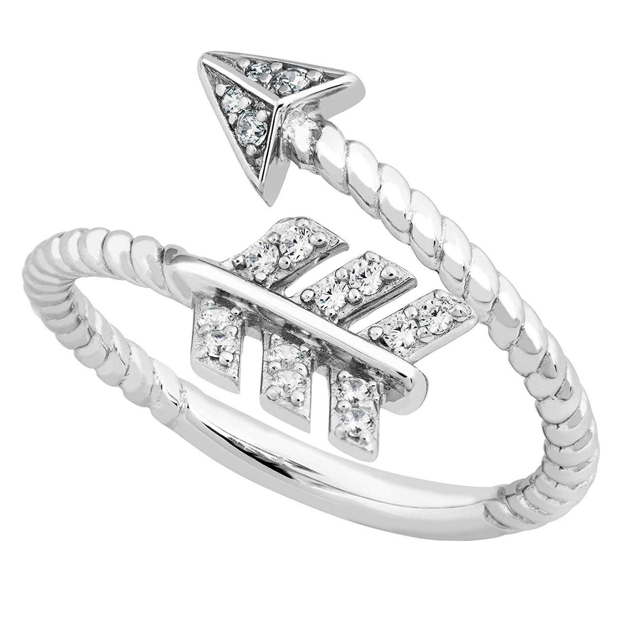 • HAND-CRAFTED Rope Trimmed Band Featuring an Arrow Embellished with Cubic Zirconia On the Tip Arrow Tip and the Fletching; Crafted in Hypoallergenic, Polished Rhodium Plated Sterling Silver