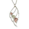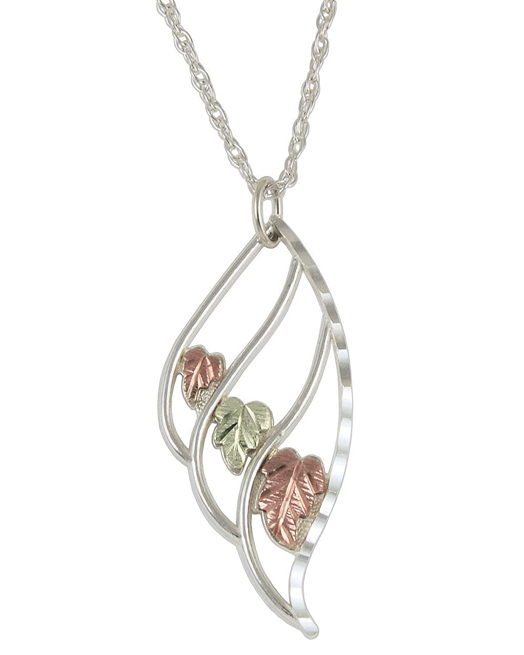 Dazzling diamond-cut edging openwork pendant with feather shape embellished with hand placed 12K rose gold and green gold petite three grape leaves; Pendant is crafted in polished sterling silver. The elegant pendant is suspended from hypoallergenic, rhodium plated sterling silver Rope chain. Whether you treat yourself or gift this to someone for a special occasion, this statement necklace will be a keepsake for generations to come. It is a great fashion accessory. This contains no nickel making it gentle on sensitive skin. Upon ordering, the jewelers in South Dakota start crafting your necklace immediately. From the casting to the hand-placed and hand-engraved leaves, it is one of the most labor intensive styles of jewelry.