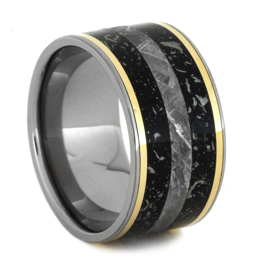 Black Stardust, Gibeon Meteorite, 14k Yellow Gold 11.5mm Comfort-Fit Titanium Band, Size 8.5