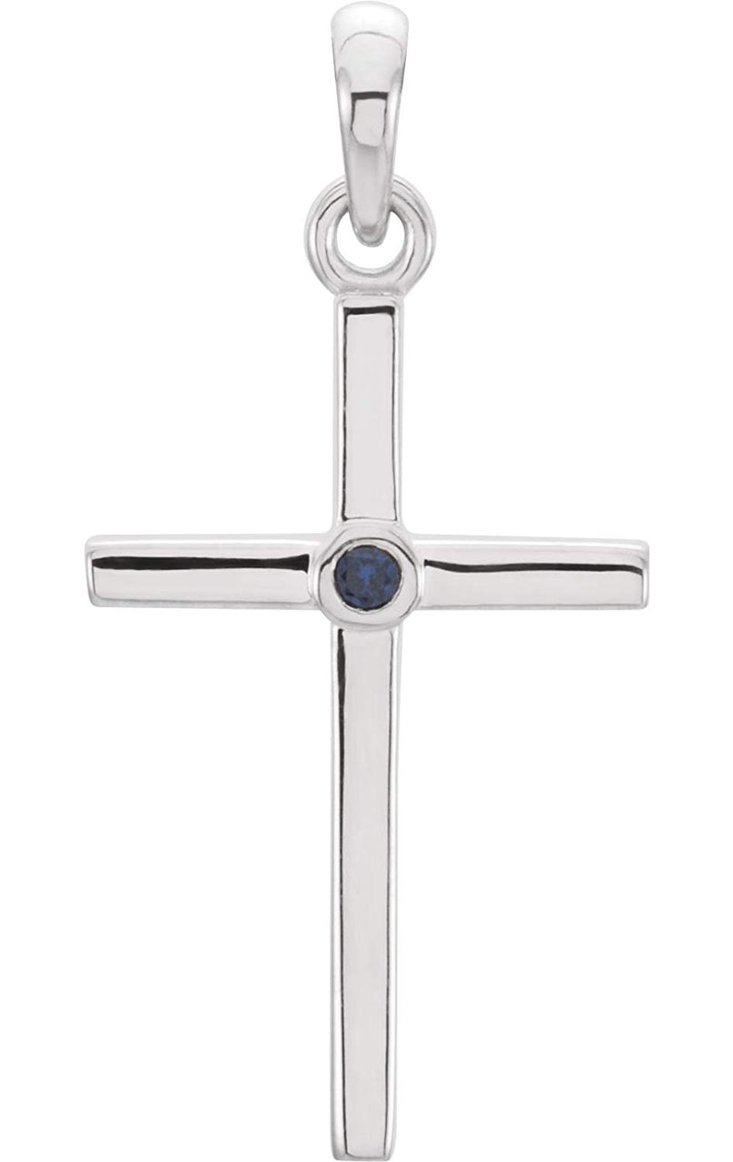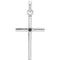• Inlaid Round Blue Sapphire On-Center Embellished with Raised Edge Border of the Flat Profile, Satin Finish Cross; Pendant is Crafted in Polished Rhodium-Plated 14k White Gold