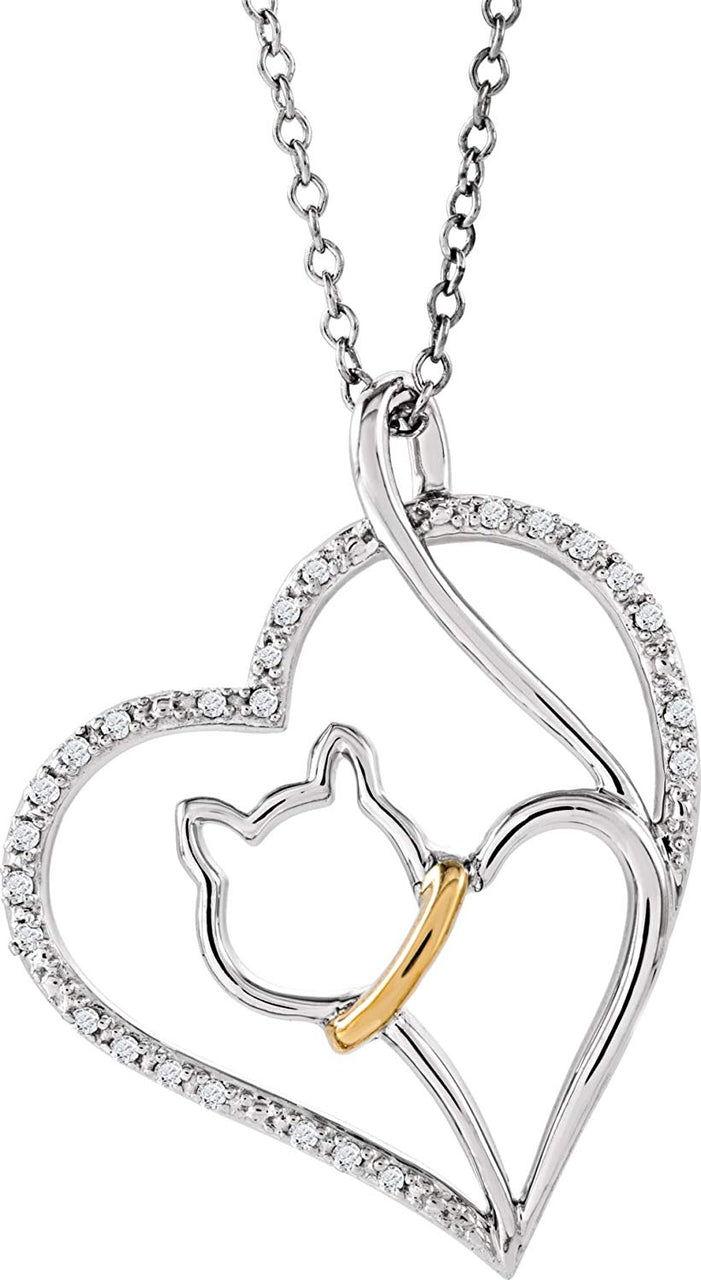 Cat Lover's Diamond Heart Necklace, Sterling Silver and 10k Yellow Gold Necklace, 18" with Charm Pet Collar Tag