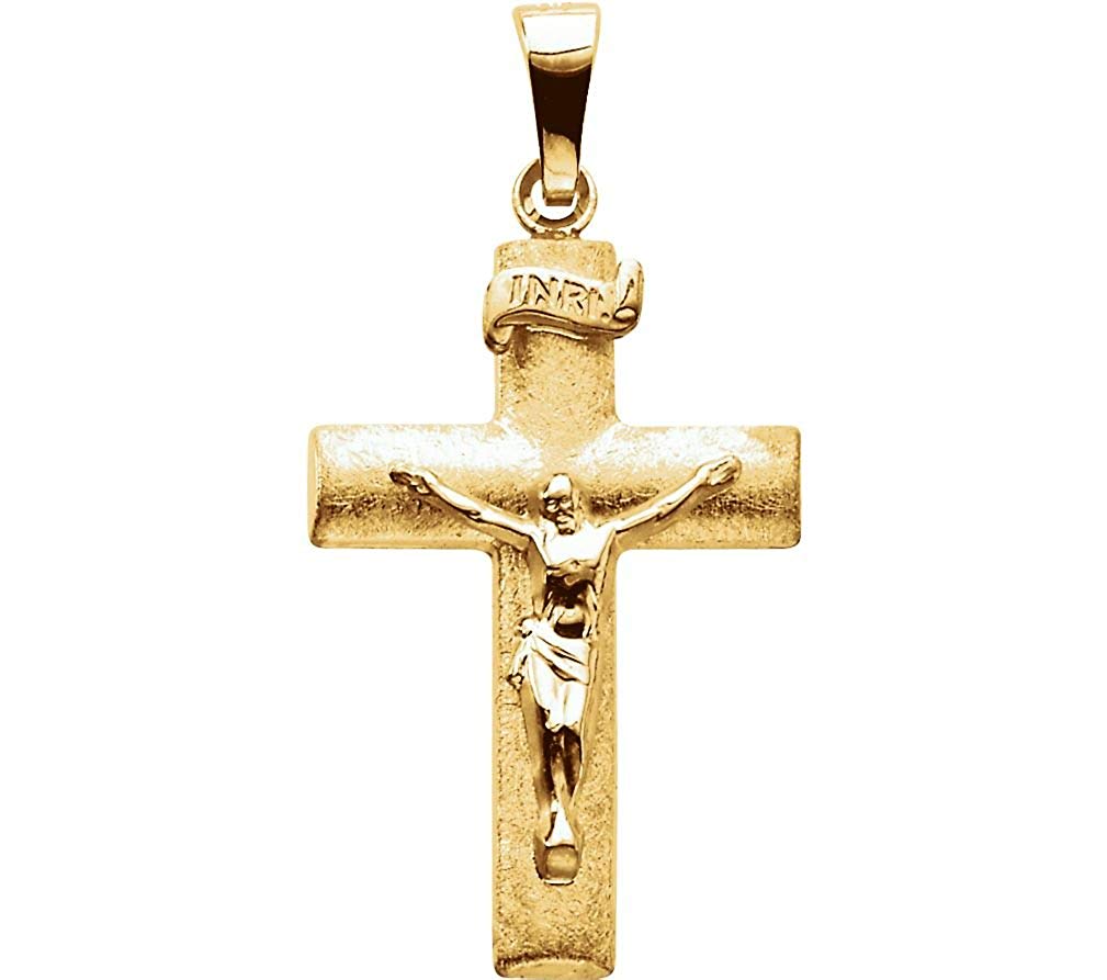 - Crucifix having Satin Brushed Finish with a Banner Across the Top is Crafted in Polished 14k Yellow Gold