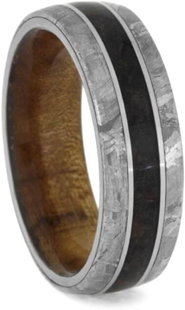- Non-Jointed Kauri Wood Inner Sleeve with Crushed Dinosaur Bone Inlay with Two Gibeon Meteorite Edges, Titanium Pinstripes on a Hypoallergenic, Comfort-Fit, Dome-Profile, Matte Titanium Wedding Band